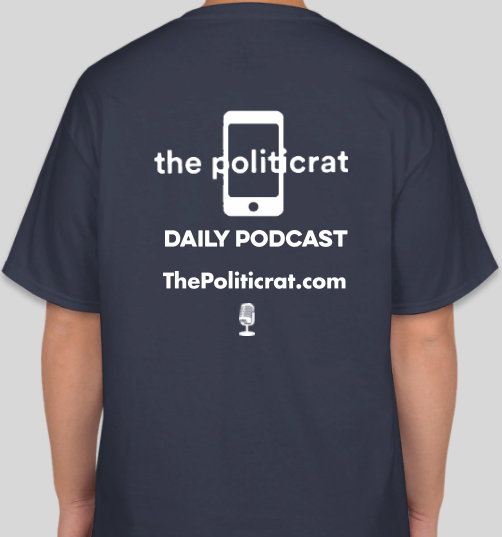 The Politicrat Daily Podcast Vote Yea Nea navy unisex t-shirt. You can vote yes or no, but you must vote. White lettering on the front. The Politicrat Daily Podcast logo and website in white on the back. Hanes 100% Cotton t-shirt. Preshrunk cotton. Available in Extra Extra Large, Extra Large, Large, Medium, Small.